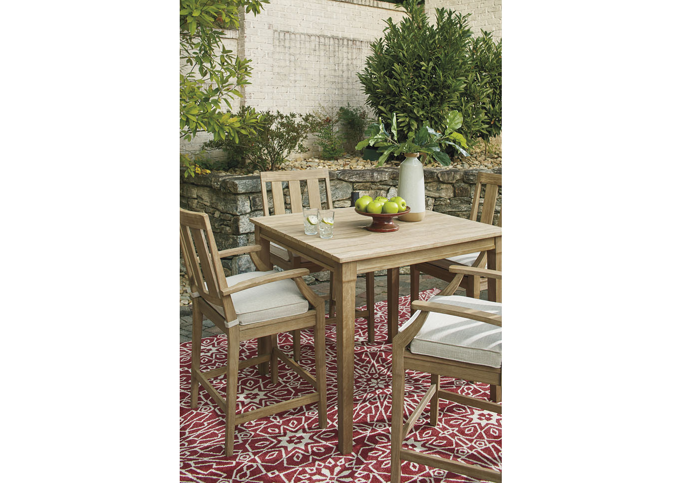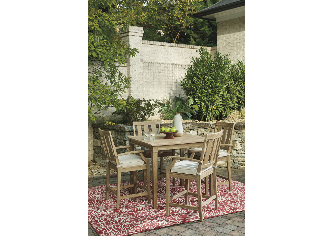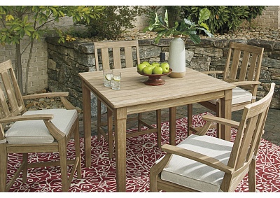 ASHLEY барный стол для улицы CLARE VIEW ( коллекция AMERICAN LIFESTYLE). .Стиль: американский Modern .Тип: квадратный барный стол для улицы(патио) на четыре персоны из эвкалиптового дерева .Цвет: бежевый .Отделка: решётчатая столешница; пятиступенчатый процесс защитного покрытия . Размеры,мм:ш.1102/г.1102/в.962.