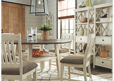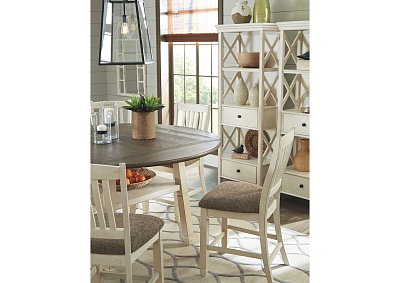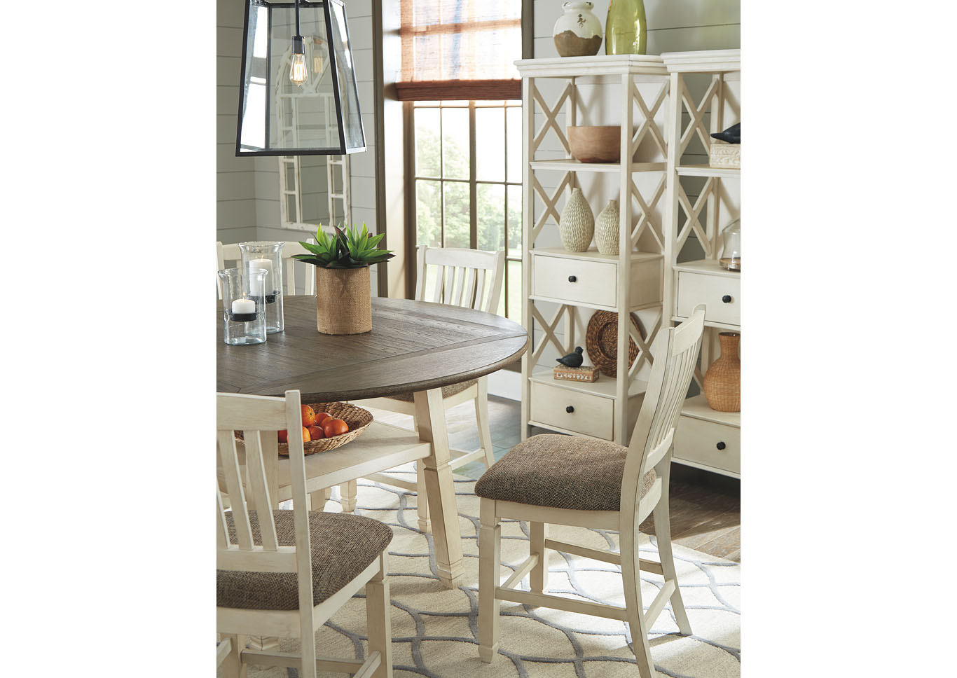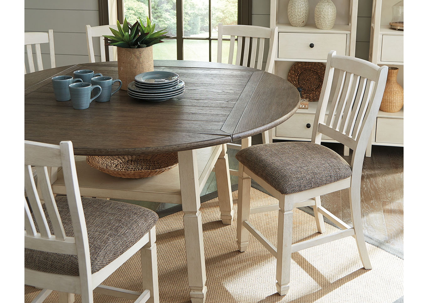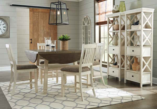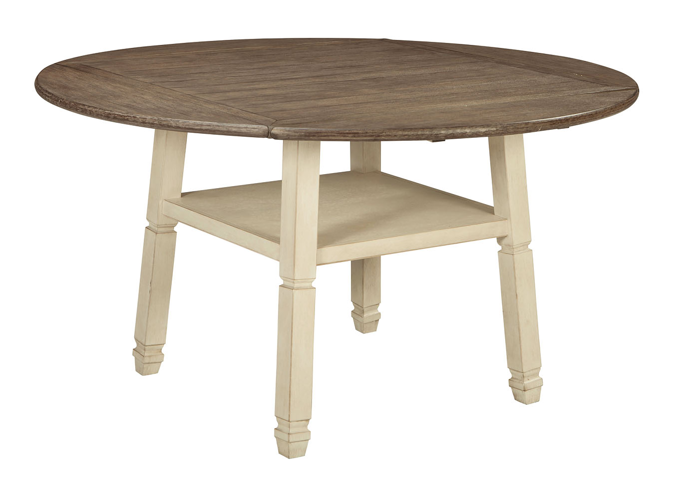 ASHLEY стол BOLANBURG( коллекция AMERICAN LIFESTYLE).Стиль: американский Casual( Mane+Mason).Тип: высокий раскладной, круглый/квадратный барный стол на шесть персон, с четырьмя откидными досками( с каждой стороны), фиксированной полкой.Размер в разложенном виде,мм:ш.1632/г.1632.Цвет: белый,коричневый.Отделка: двухцветная текстурная искусственно состаренная,дощатый эффект столешницы,дубовый шпон.Размеры,мм:ш.1170/г.1170/в.911.