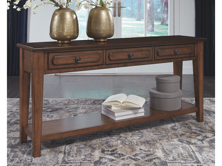 ASHLEY стол ADINTON (коллекция AMERICAN LIFESTYLE).Стиль: американский Traditional.Тип: консольный стол с тремя выдвижными ящиками и одной открытой фиксированной полкой.Цвет: коричневый.Отделка: полированная, берёзовый шпон,металлическая фурнитура.Размеры,мм:ш.1626/г.381/в.762.