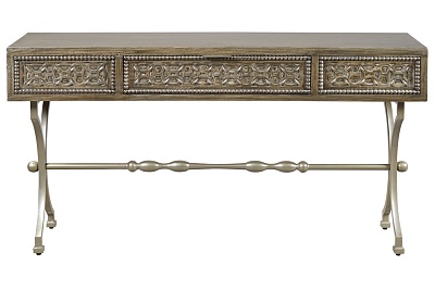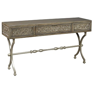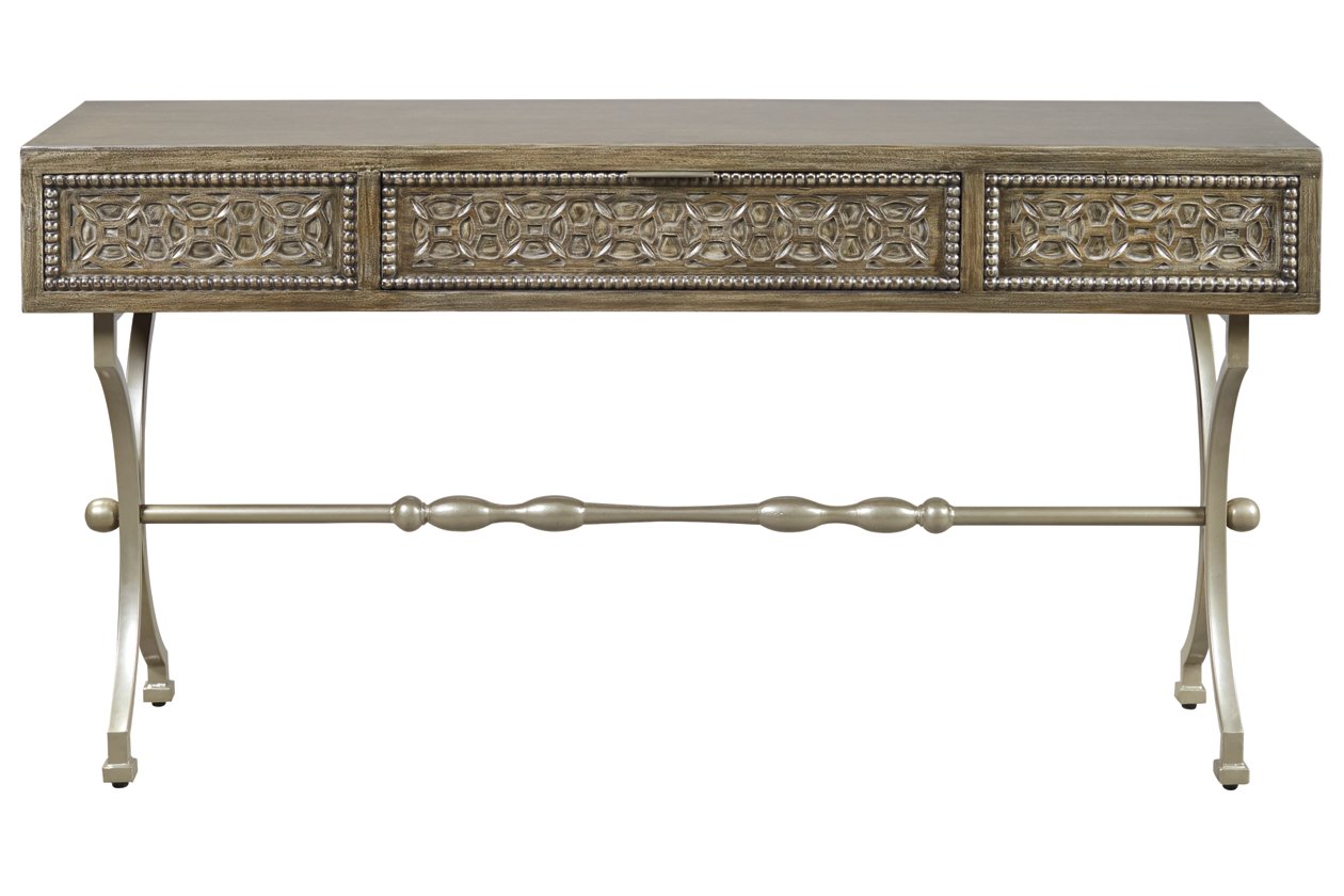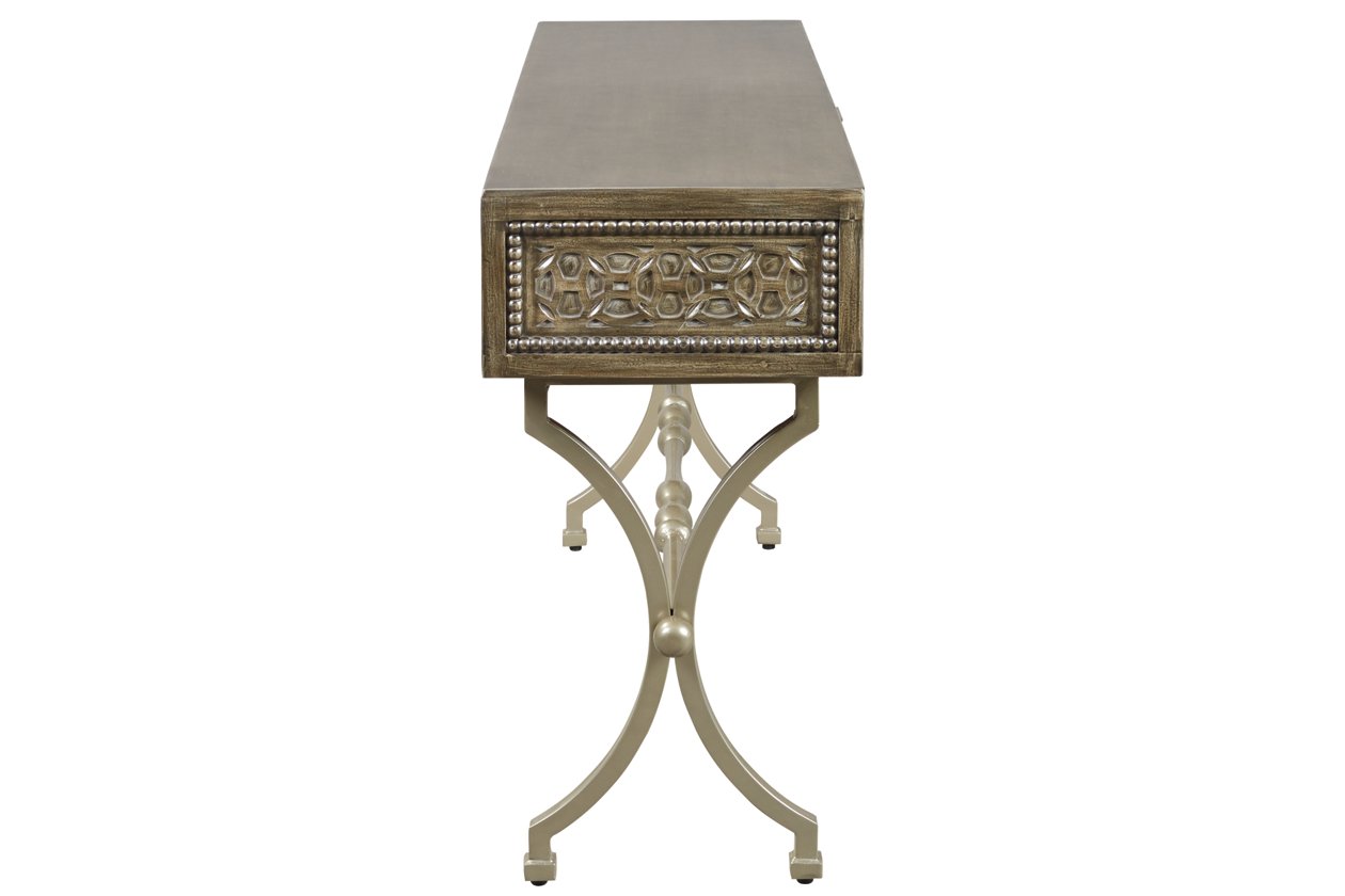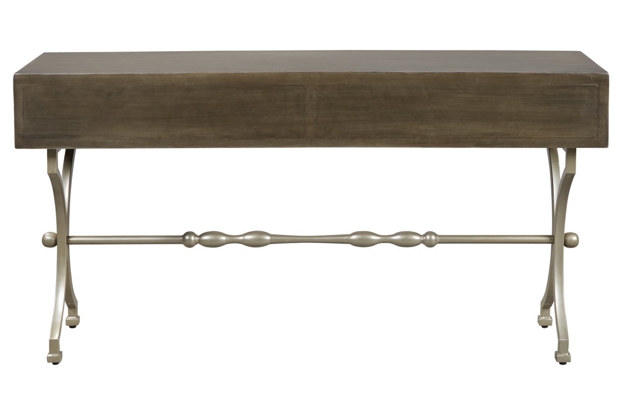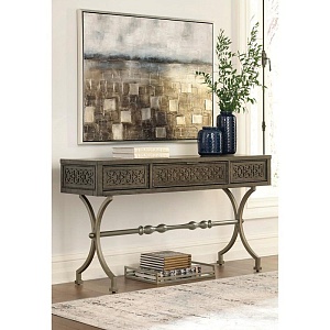 ASHLEY стол QUINNLAND(коллекция AMERICAN LIFESTYLE).Стиль:американский Vintage Casual.Тип:акцентный консольный стол с одним выдвижным ящиком.Цвет:серо-коричневый.Отделка:искусственно состаренная патинированная,с декоративной резьбой в виде медальонов,металл цвета шампанского.Размеры,мм:ш.1524/г.406/в.813.