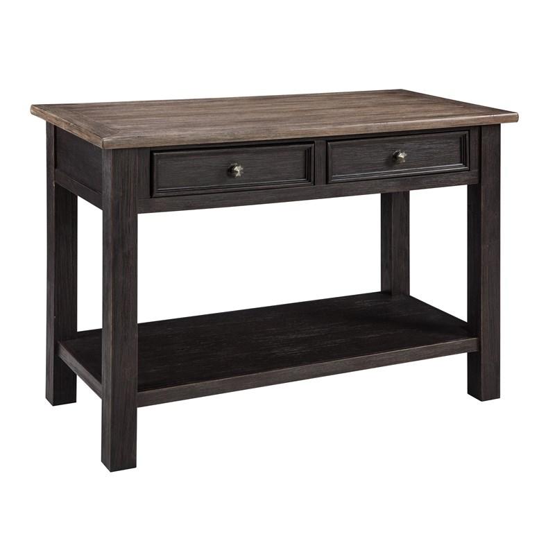 ASHLEY стол TYLER CREEK (коллекция AMERICAN LIFESTYLE).Стиль: американский Casual.Тип: прямоугольный консольный стол, с двумя выдвижными ящиками и одной фиксированной нижней полкой.Цвет: серо-коричневый/чёрный.Отделка: двухцветная текстурная; искусственно состаренный шпон дуба; дощатая столешница; металлическая фурнитура тёмно-бронзового цвета.Размеры,мм:ш.1170/г.560/в.840.