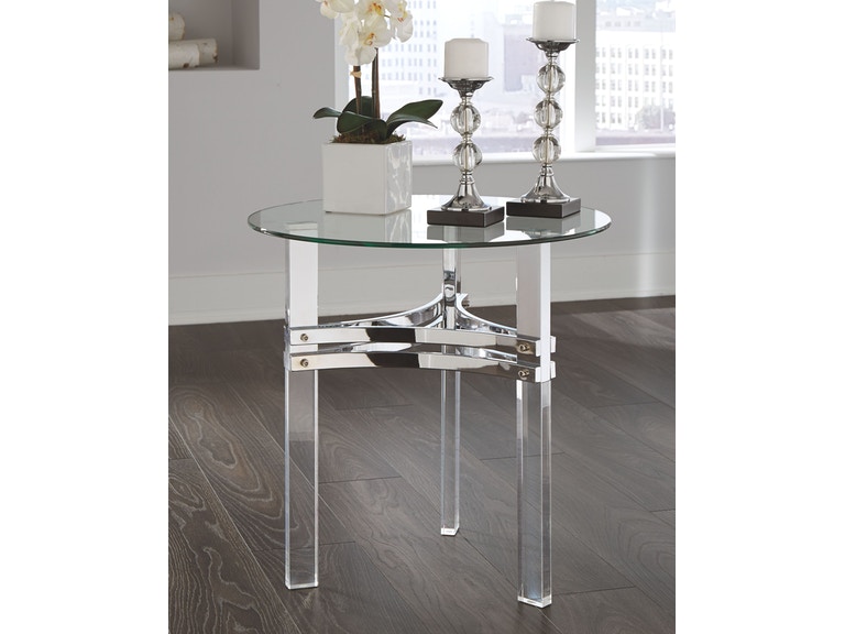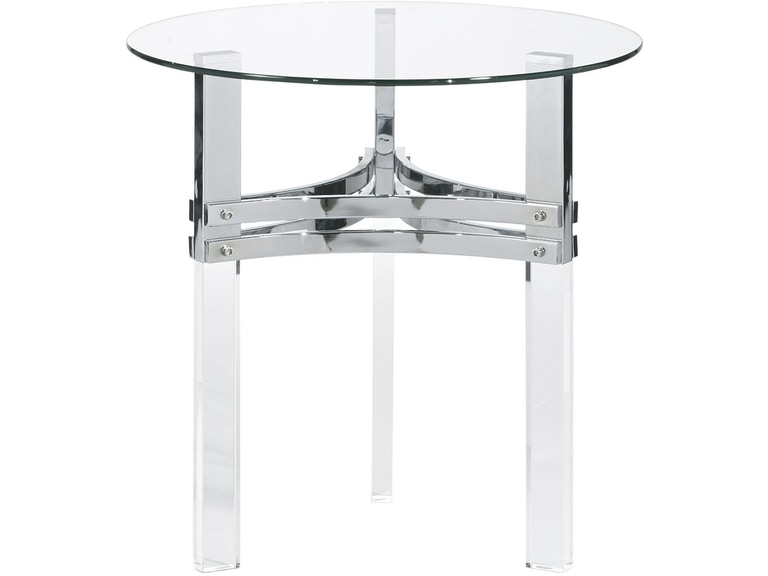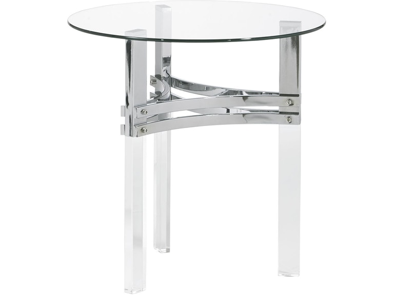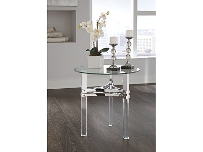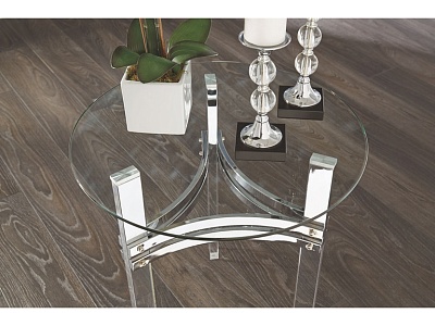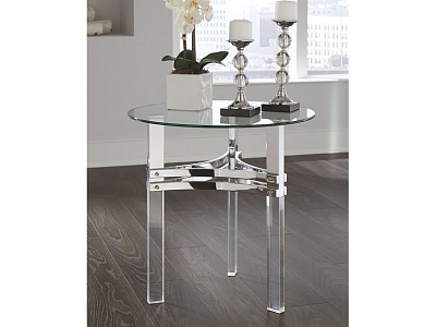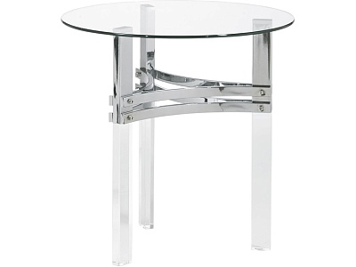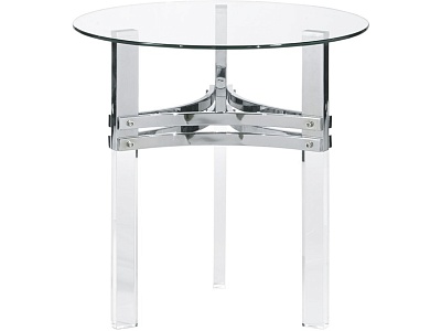 ASHLEY стол BRADDONI (коллекция AMERICAN LIFESTYLE).Стиль: американский Modern.Тип: круглый приставной стеклянный стол с акрилово/металлическим основанием.Цвет: прозрачный.Отделка: термостекло, хромированные металлические акценты .Размеры,мм: ш.584/г.584/в.559.