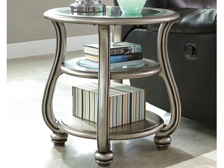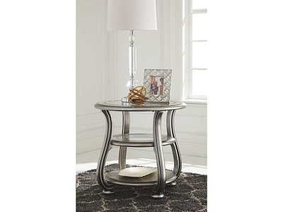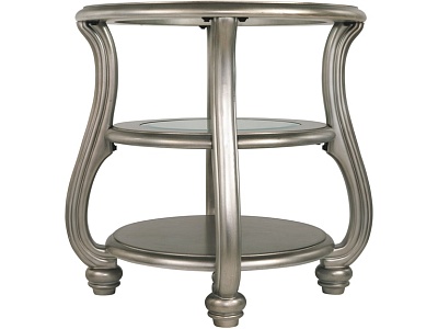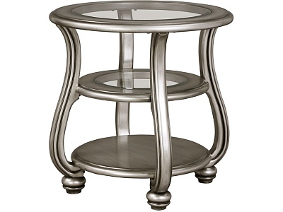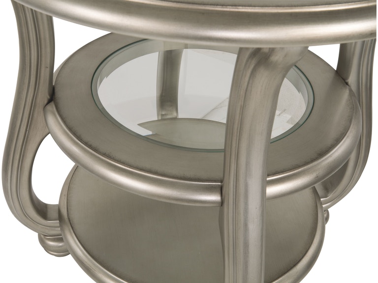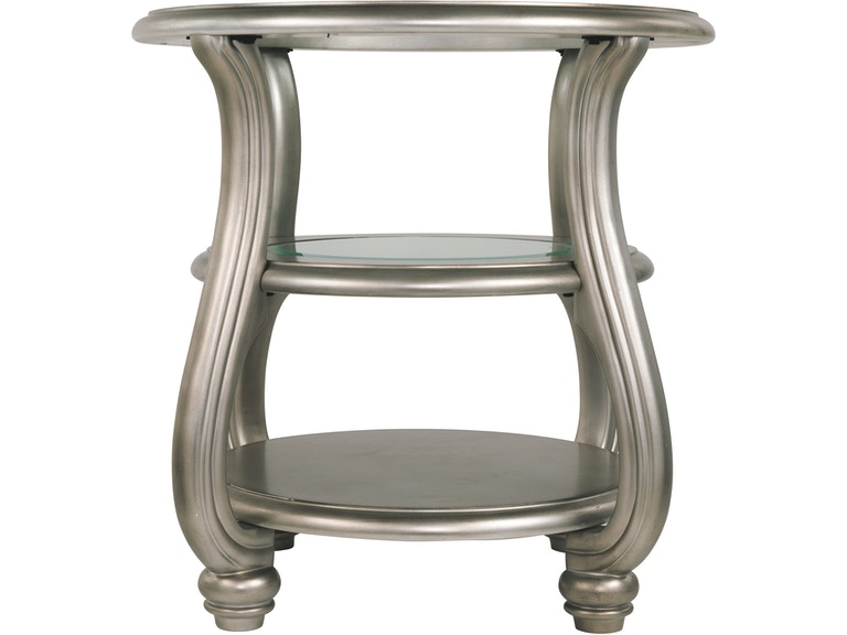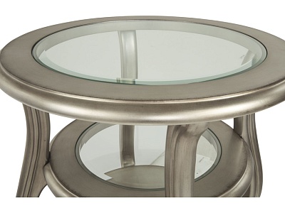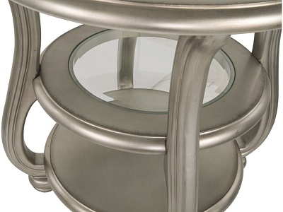 ASHLEY стол CORALAYNE (коллекция AMERICAN LIFESTYLE).Стиль:американский Traditional .Тип: круглый приставной стол с двумя открытыми фиксированными полками,верхняя и средняя из прозрачного термостекла.Цвет:серебро.Отделка:патинированный металлический блеск.Размеры,мм:ш.660/г.660/в.660.