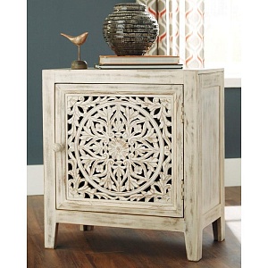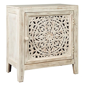ASHLEY стол FOSSIL RIDGE ( коллекция AMERICAN LIFESTYLE).Стиль: американский Vintage Casual.Тип: прямоугольный акцентный приставной стол с одним шкафом и одной полкой.Цвет: белый.Отделка: искусственно состаренная;цветочная резьба на дверце шкафа .Размеры,мм: ш.610/г.384/в.686.