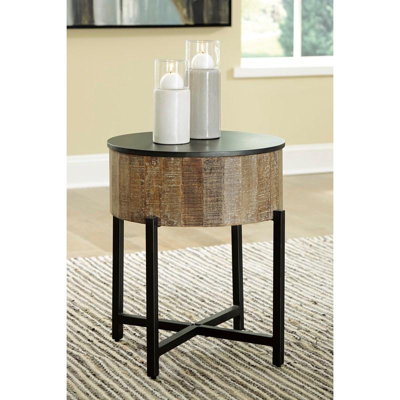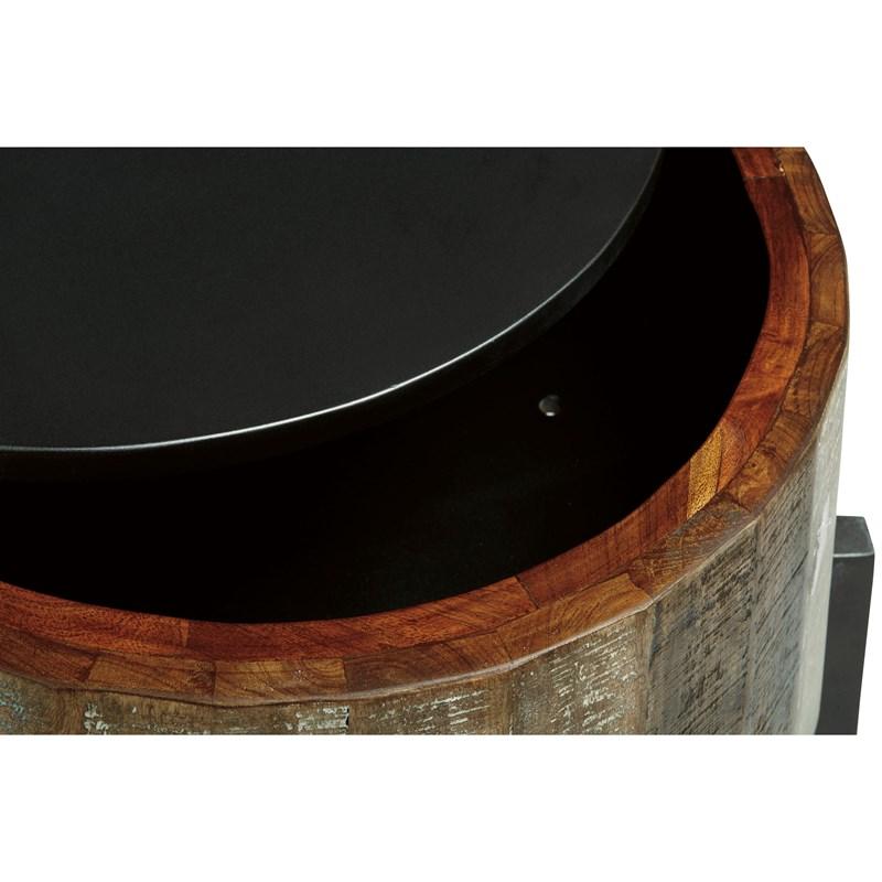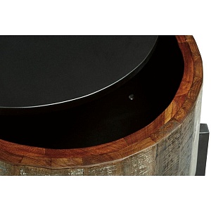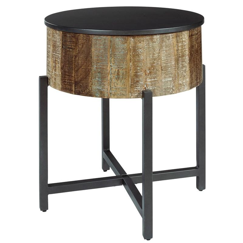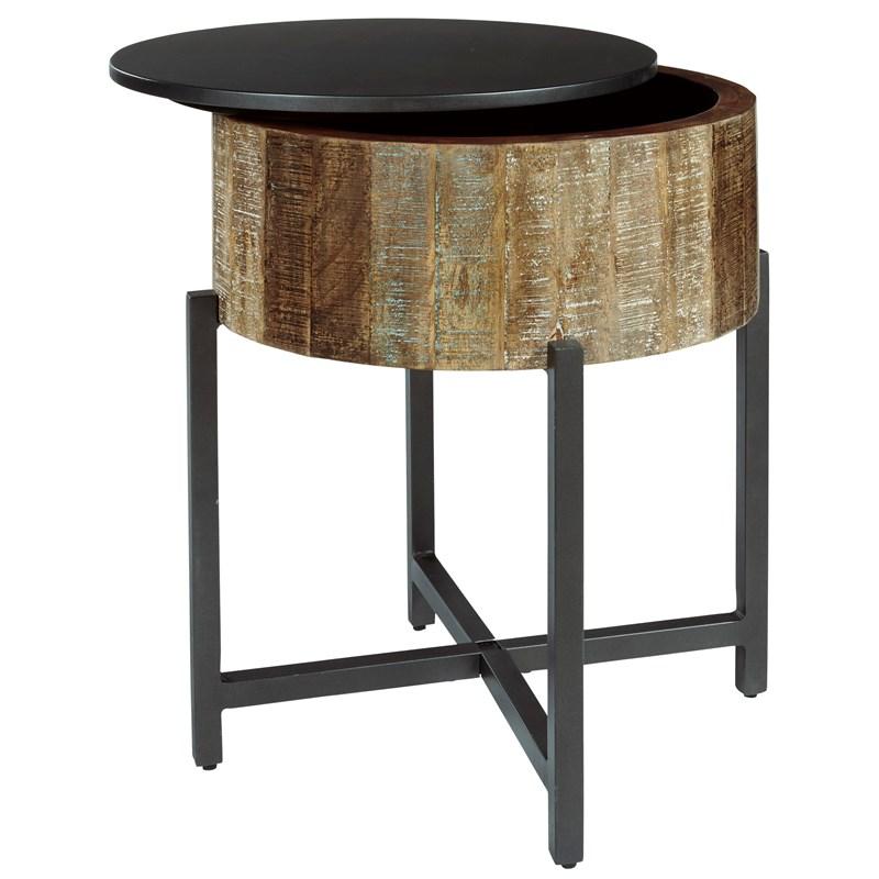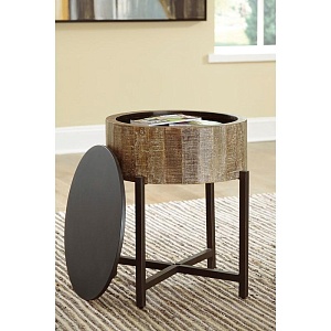 ASHLEY стол NASHBRYN (коллекция AMERICAN LIFESTYLE).Стиль: американский Casual.Тип: круглый приставной стол в виде барабана со скрытым под крышкой хранилищем на металлическом основании.Цвет: серый/коричневый.Отделка: многоцветный оттенок дерева манго с белыми восковыми вставками.Размеры,мм:ш.527/г.527/в.616.
