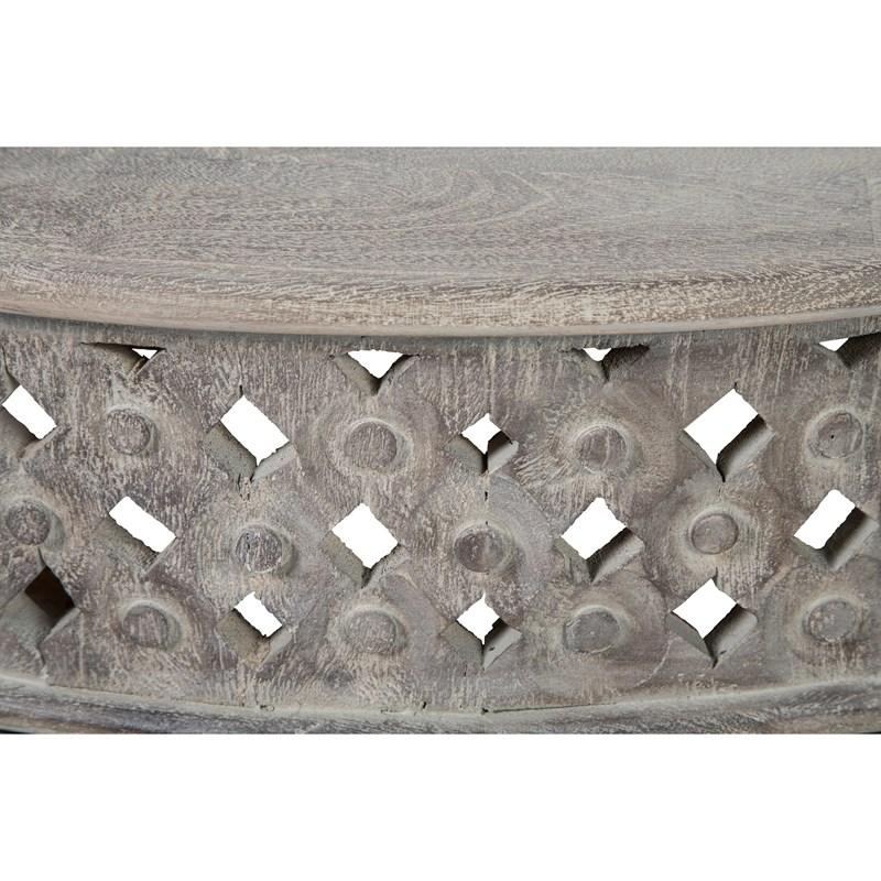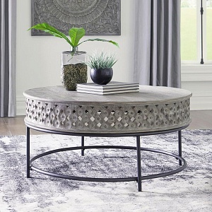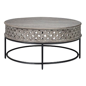 ASHLEY стол RASTELLA (коллекция AMERICAN LIFESTYLE).Стиль: американский Casual.Тип: круглый журнальный стол с резным фартуком на металлическом основании.Цвет: серый/чёрный.Отделка: полированное дерево индийского манго; .Размеры,мм:ш.965/г.965/в.457.
