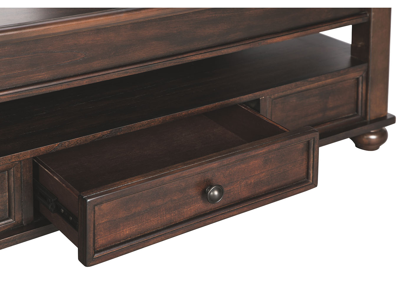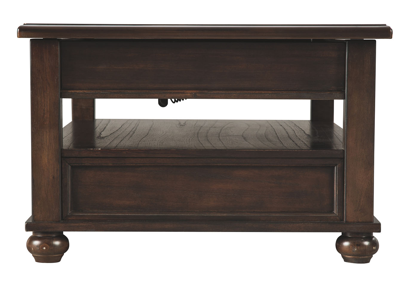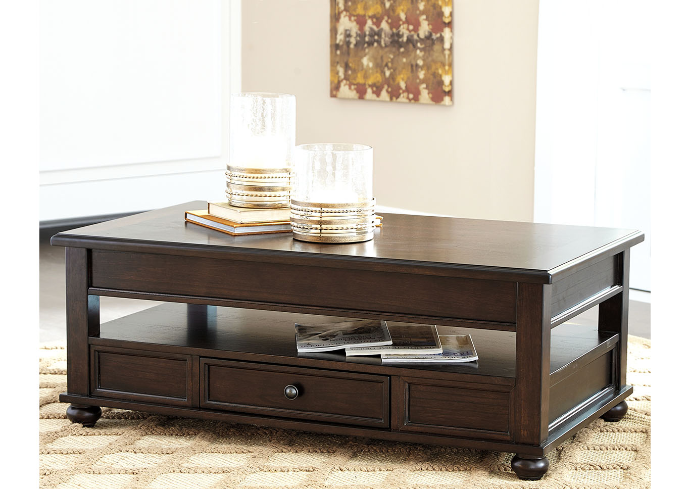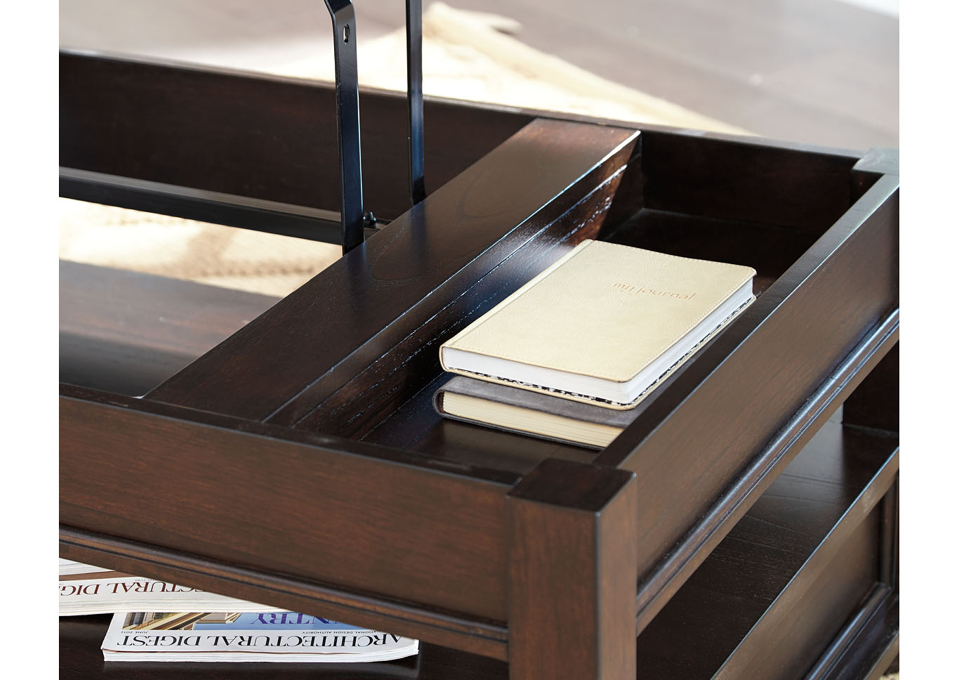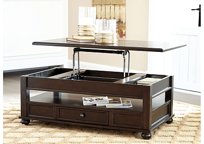 ASHLEY стол BARILANNI (коллекция AMERICAN LIFESTYLE).Стиль: американский Casual.Тип: прямоугольный журнальный стол трансформер с подъёмным механизмом со скрытым хранилищем, одним ящиком и одной открытой фиксированной полкой.Цвет: тёмно-коричневый.Отделка: металлическая фурнитура бронзового цвета.Размеры,мм:ш.1210/г.712/в.464.