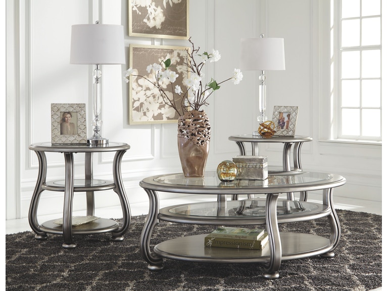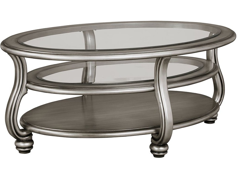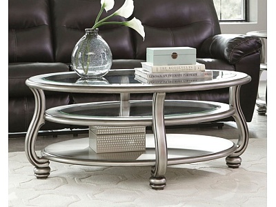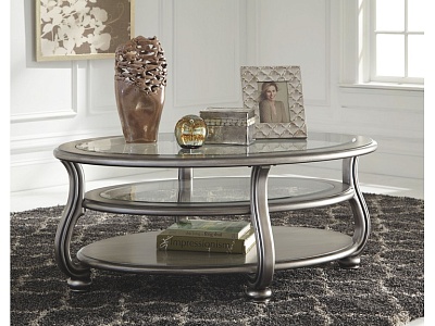 ASHLEY стол CORALAYNE (коллекция AMERICAN LIFESTYLE).Стиль:американский Traditional .Тип: овальный журнальный стол с двумя открытыми фиксированными полками,верхняя и средняя из прозрачного термостекла.Цвет:серебро.Отделка:патинированный металлический блеск.Размеры,мм:ш.1220/г.860/в.500.