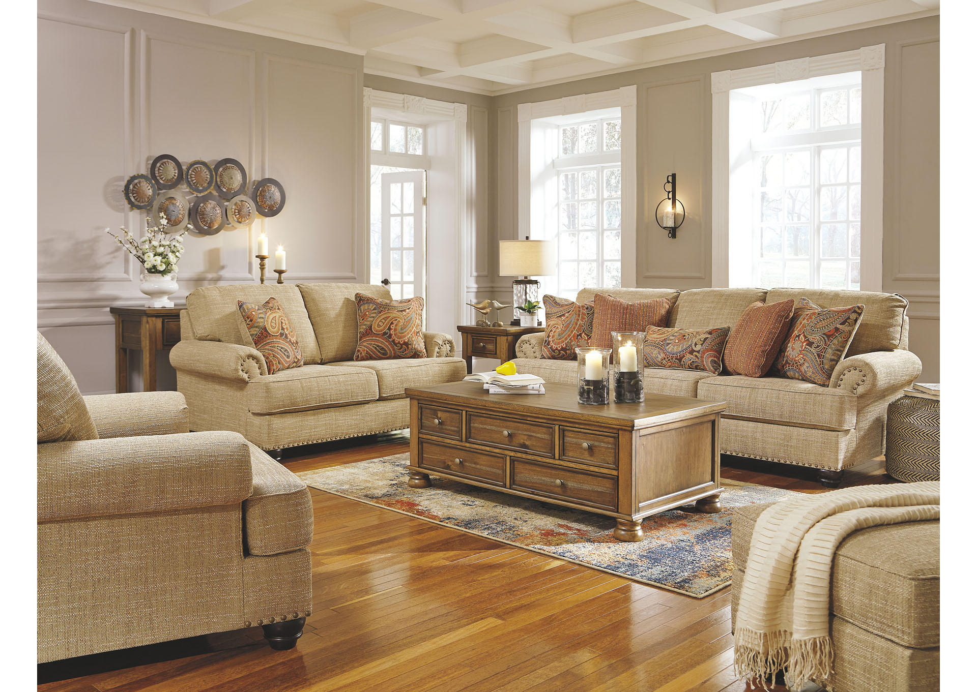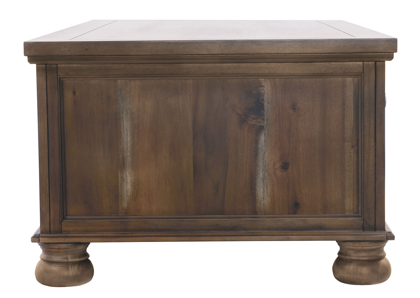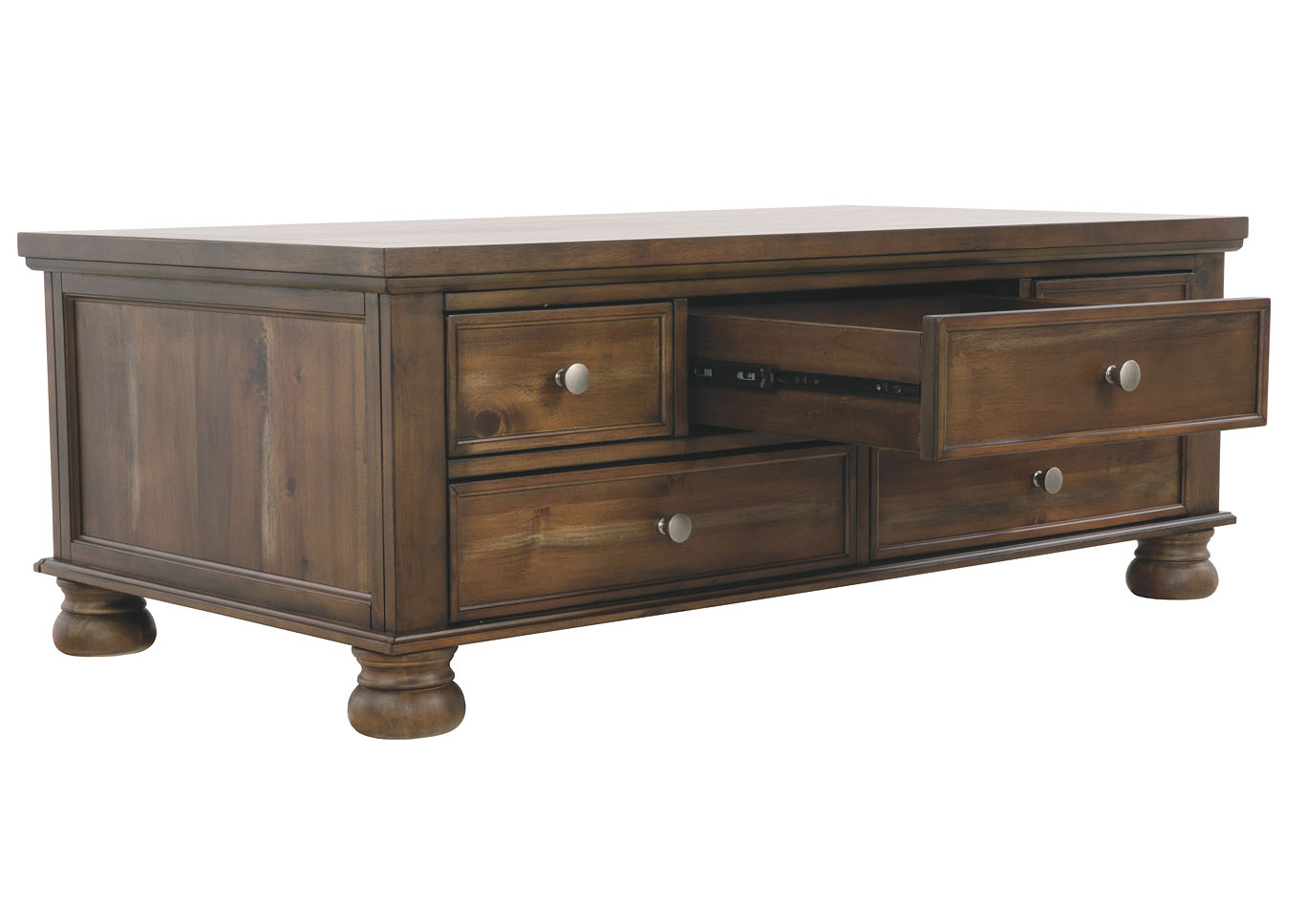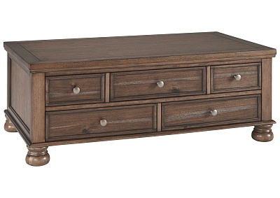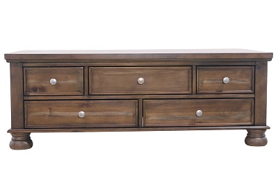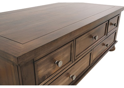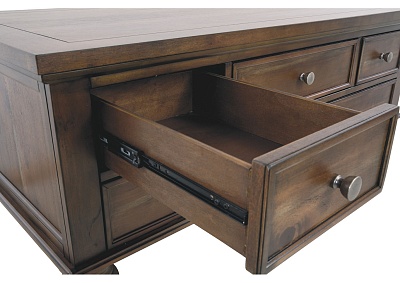 ASHLEY стол FLYNNTER (коллекция AMERICAN LIFESTYLE).Стиль: американский Casual.Тип: прямоугольный журнальный стол с пятью выдвижными ящиками.Цвет: коричневый.Отделка: шпон каштана; искусственно состаренная оловянная фурнитура.Размеры:ш.1321/г.711/в.480.