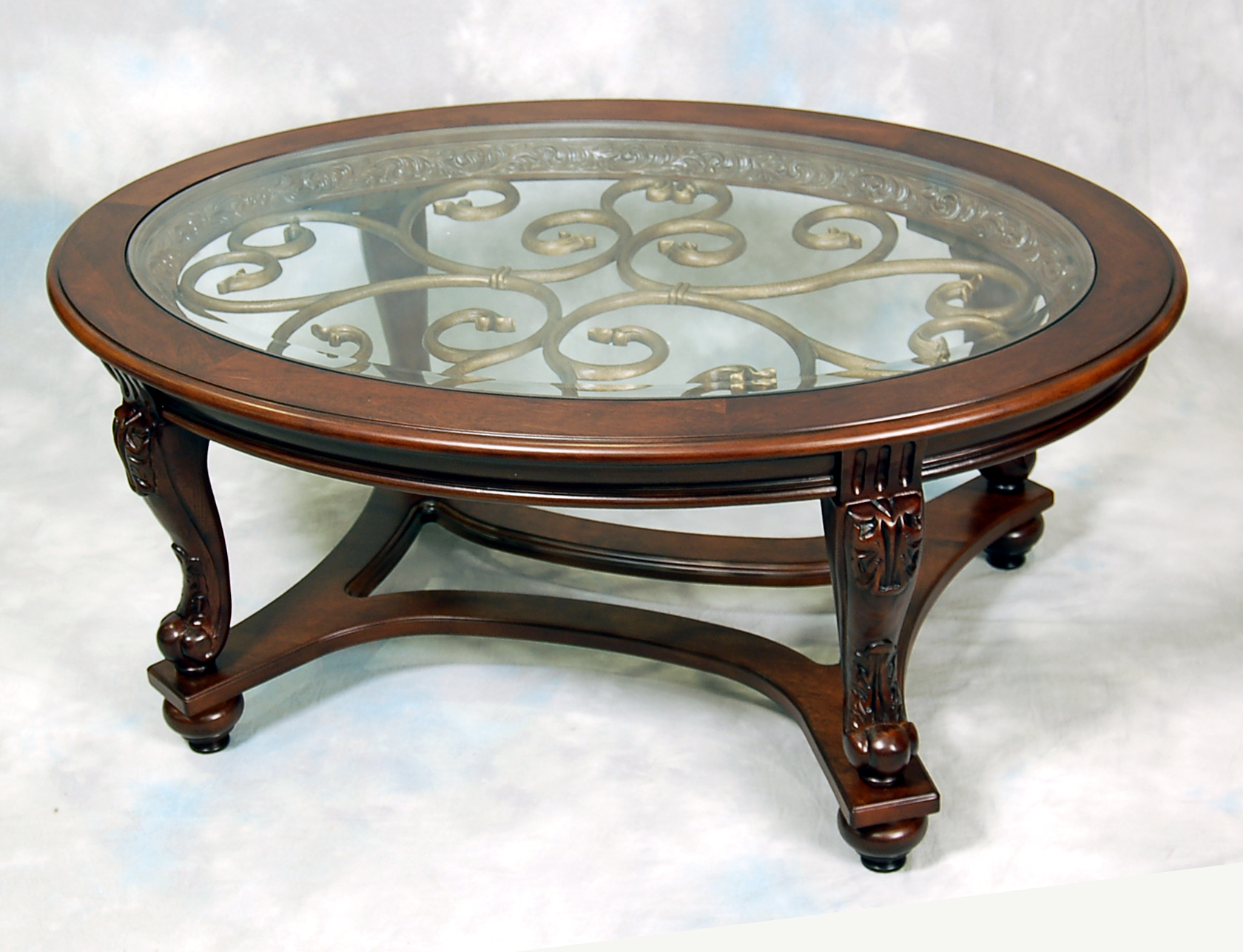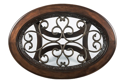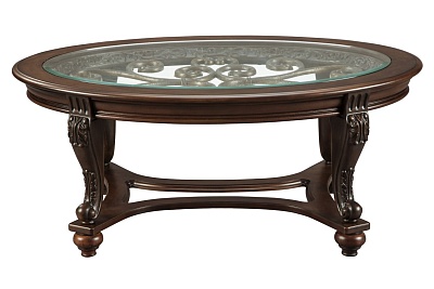 ASHLEY стол NORCASTLE (коллекция AMERICAN LIFESTYLE).Стиль: американский New Traditions.Тип: овальный журнальный(кофейный) стол.Цвет:коричневый.Отделка:термополированное стекло с фацетом,литой вензель, шпон берёзы,декоративные элементы из литой смолы.Размеры,мм:ш.1219/г.864/в.514.