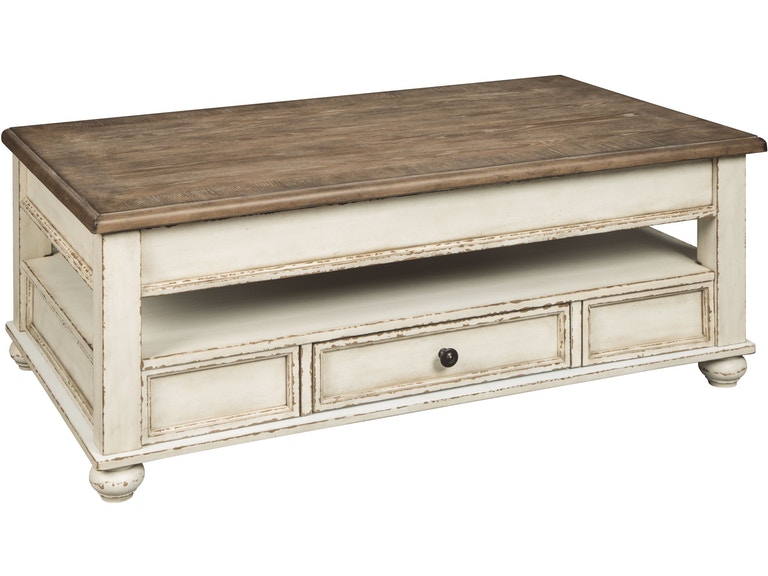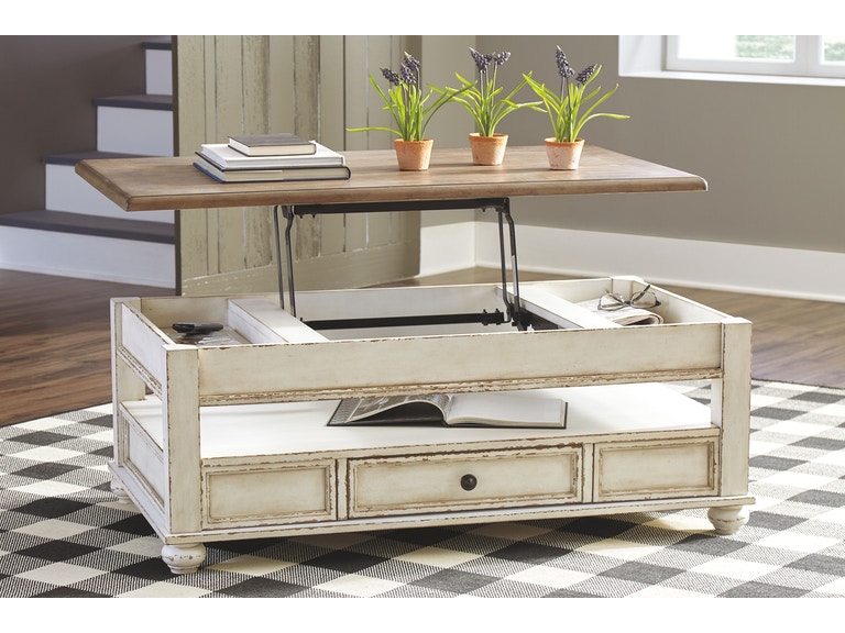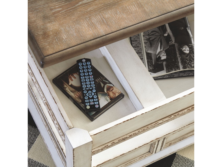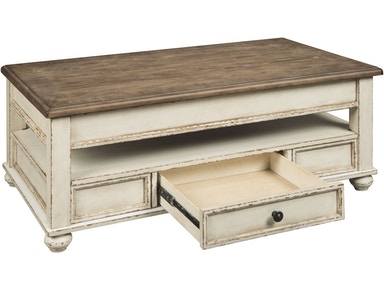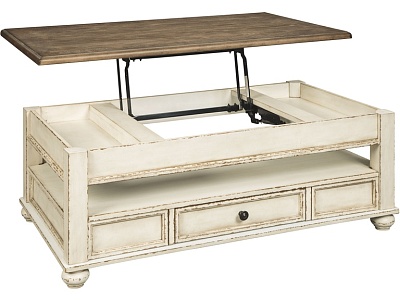 ASHLEY стол REALYN (коллекция AMERICAN LIFESTYLE).Стиль: американский Vintage Casual.Тип: прямоугольный журнальный стол трансформер с подъёмным механизмом, одним ящиком и одной открытой фиксированной полкой.Цвет: белый/коричневый.Отделка: патинированная искусственно состаренная, шпон дуба,акцентные элементы из литой смолы,антикварная металлическая фурнитура.Размеры,мм:ш.1213/г.711/в.461.