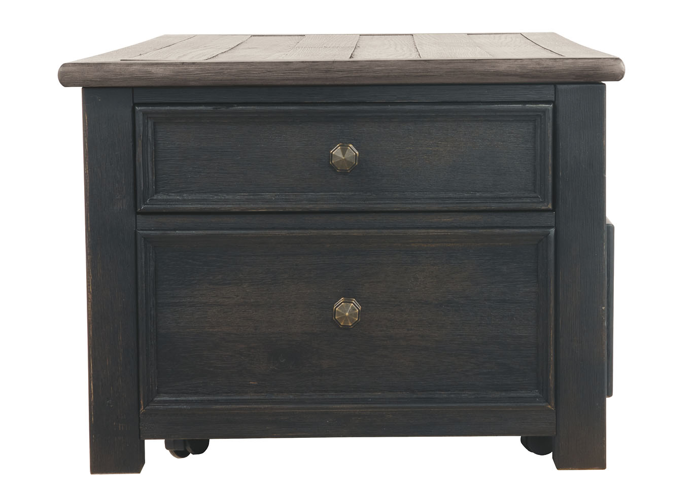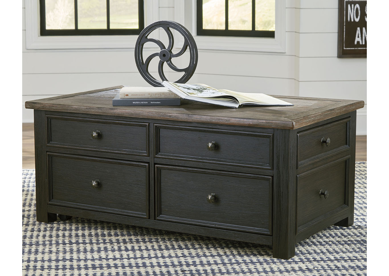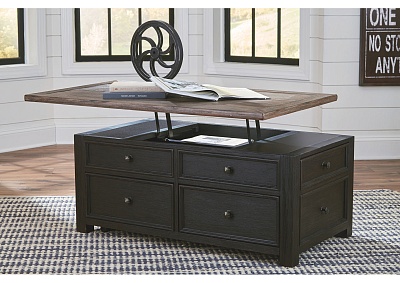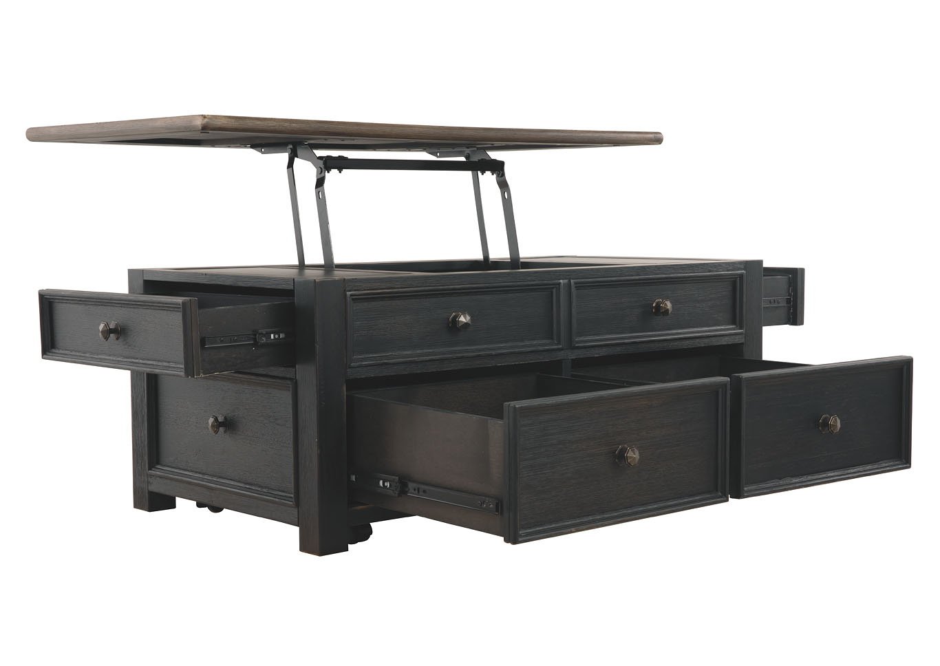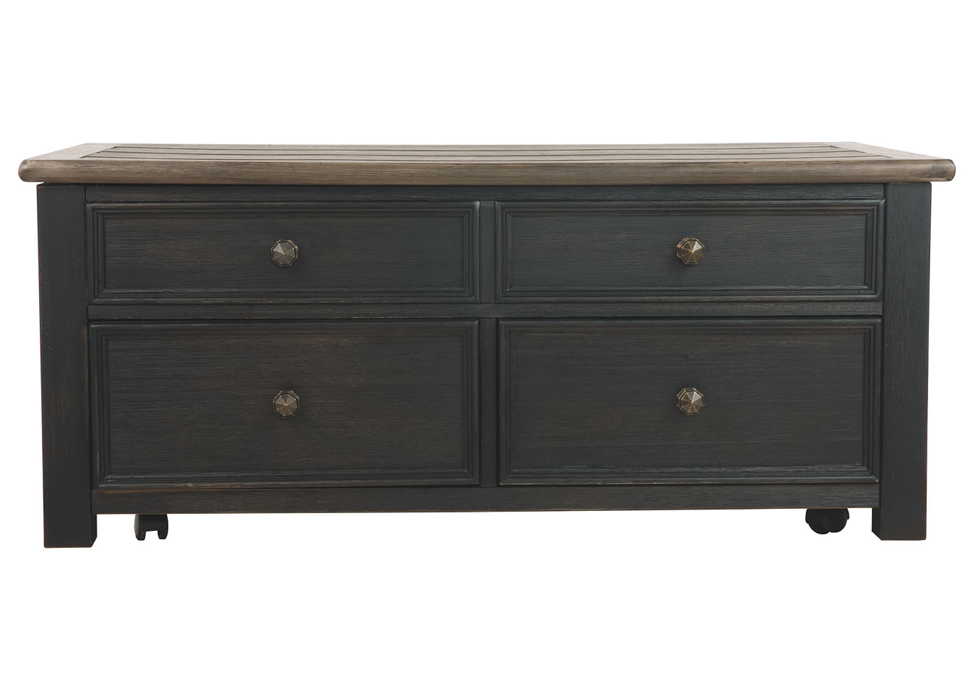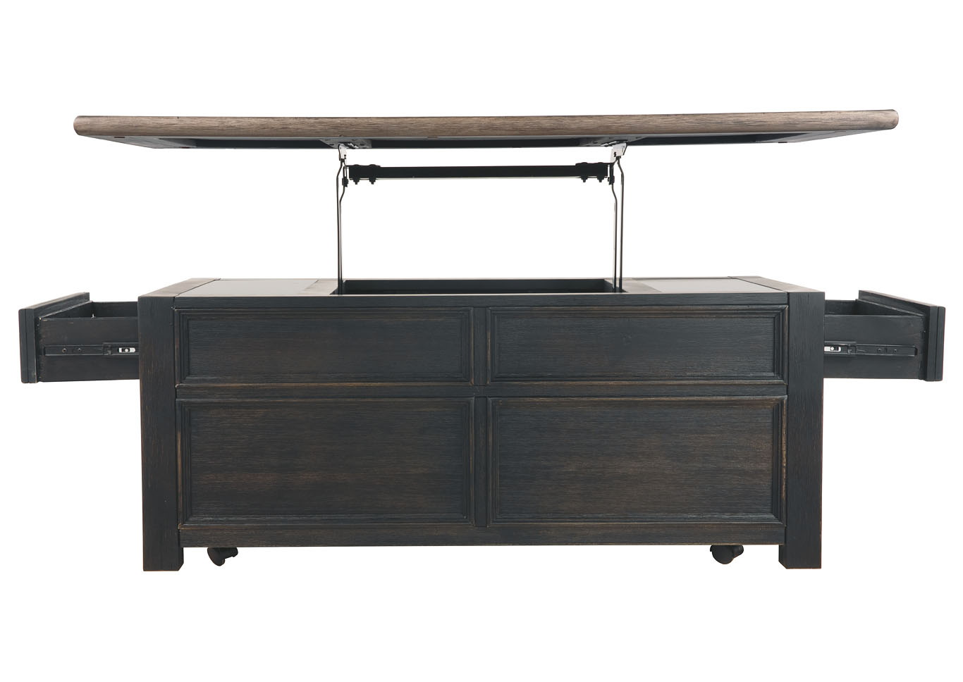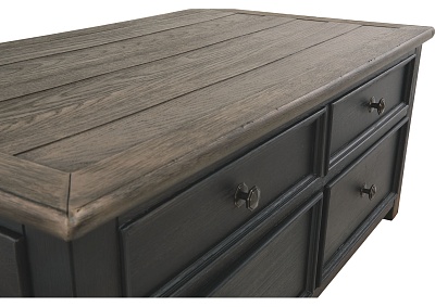 ASHLEY стол TYLER CREEK (коллекция AMERICAN LIFESTYLE).Стиль: американский Casual.Тип: прямоугольный журнальный стол трансформер с подъёмным механизмом, четырьмя выдвижными ящиками, на мебельных колёсиках.Цвет: серо-коричневый/чёрный.Отделка: двухцветная текстурная; искусственно состаренный шпон дуба; дощатая столешница; металлическая фурнитура тёмно-бронзового цвета.Размеры,мм:ш.1170/г.660/в.500.