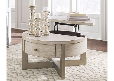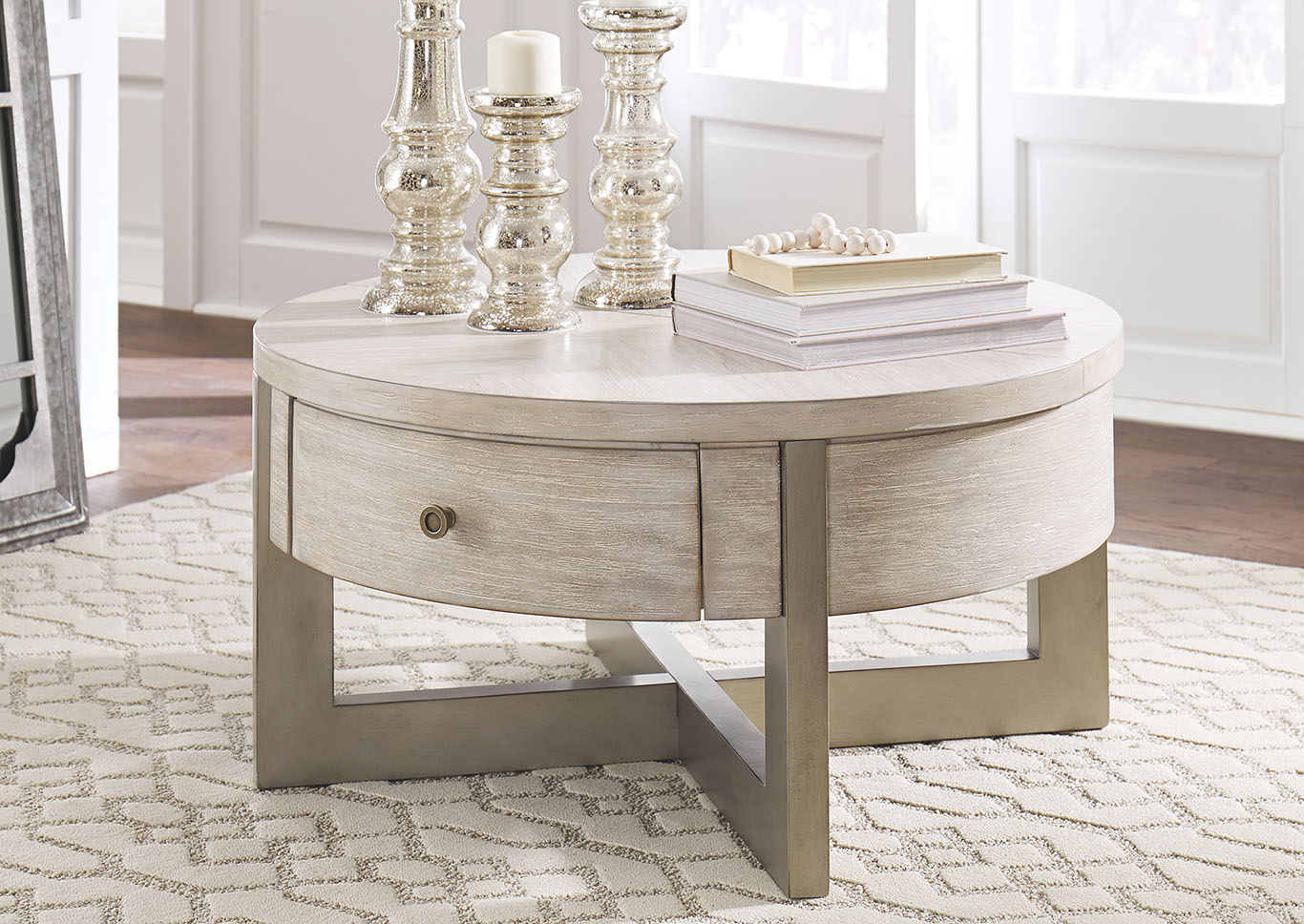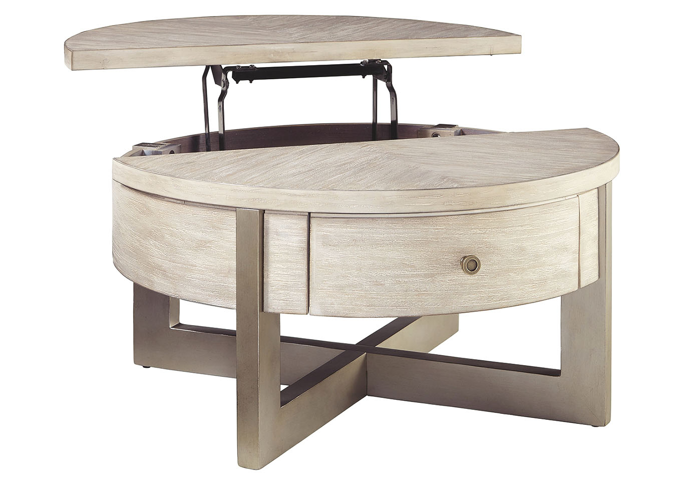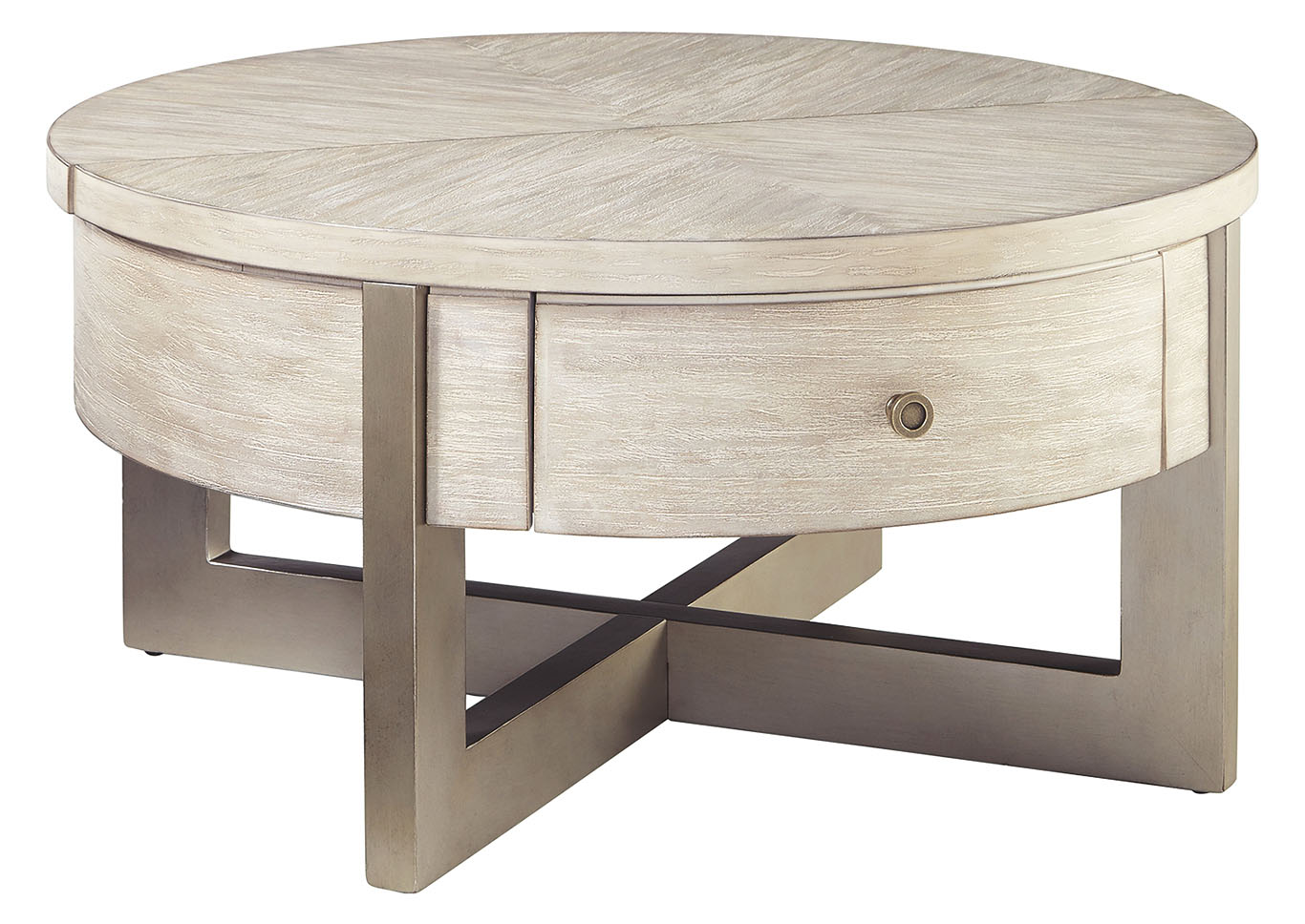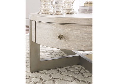 ASHLEY стол URLANDER (коллекция AMERICAN LIFESTYLE).Стиль: американский Modern.Тип: круглый журнальный стол трансформер барабанной конструкции на металлическом основании, с подъёмным механизмом и одним ящиком.Цвет: бежево- белый.Отделка: белёная; металлическая фурнитура.Размеры,мм:ш.910/г.910/в.460.