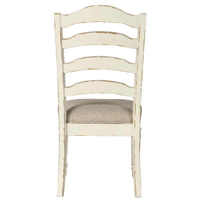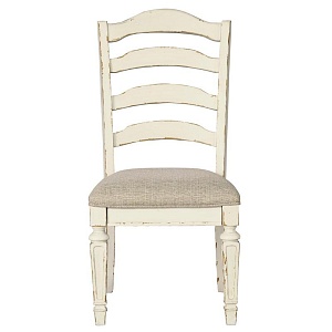 ASHLEY стул REALYN(коллекция AMERICAN LIFESTYLE).Стиль: американский Vintage Casual.Тип: обеденный стул с мягким сиденьем.Цвет: слоновая кость(белый),бежевый.Обивка: сложнофактурная ткань 100% полиэстер,категория высшая,одобрена по высоким американским стандартам AHFA(износостойкость,долговечность).Отделка: патинированная двухцветная, искусственно состаренная,спинка изогнутая в виде лестницы.Размеры,мм:ш.508/г.629/в.1038.