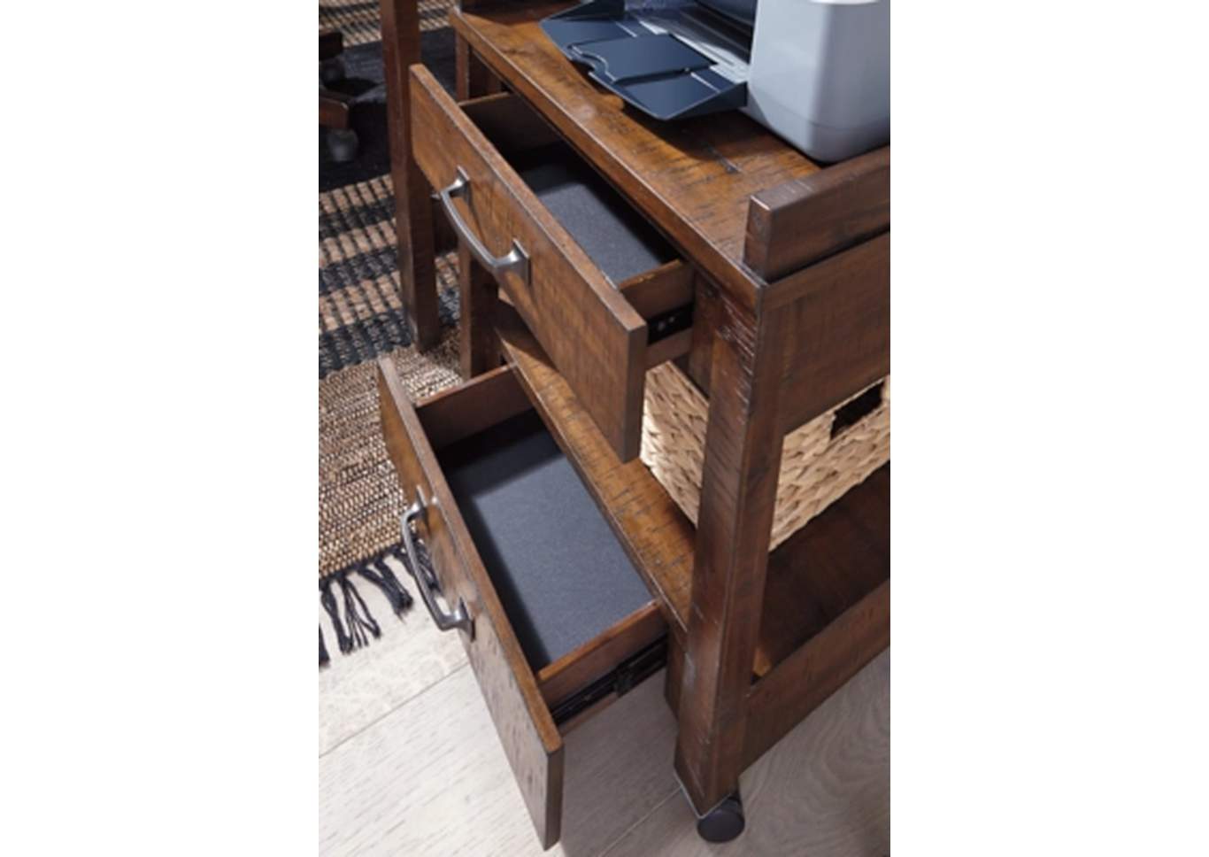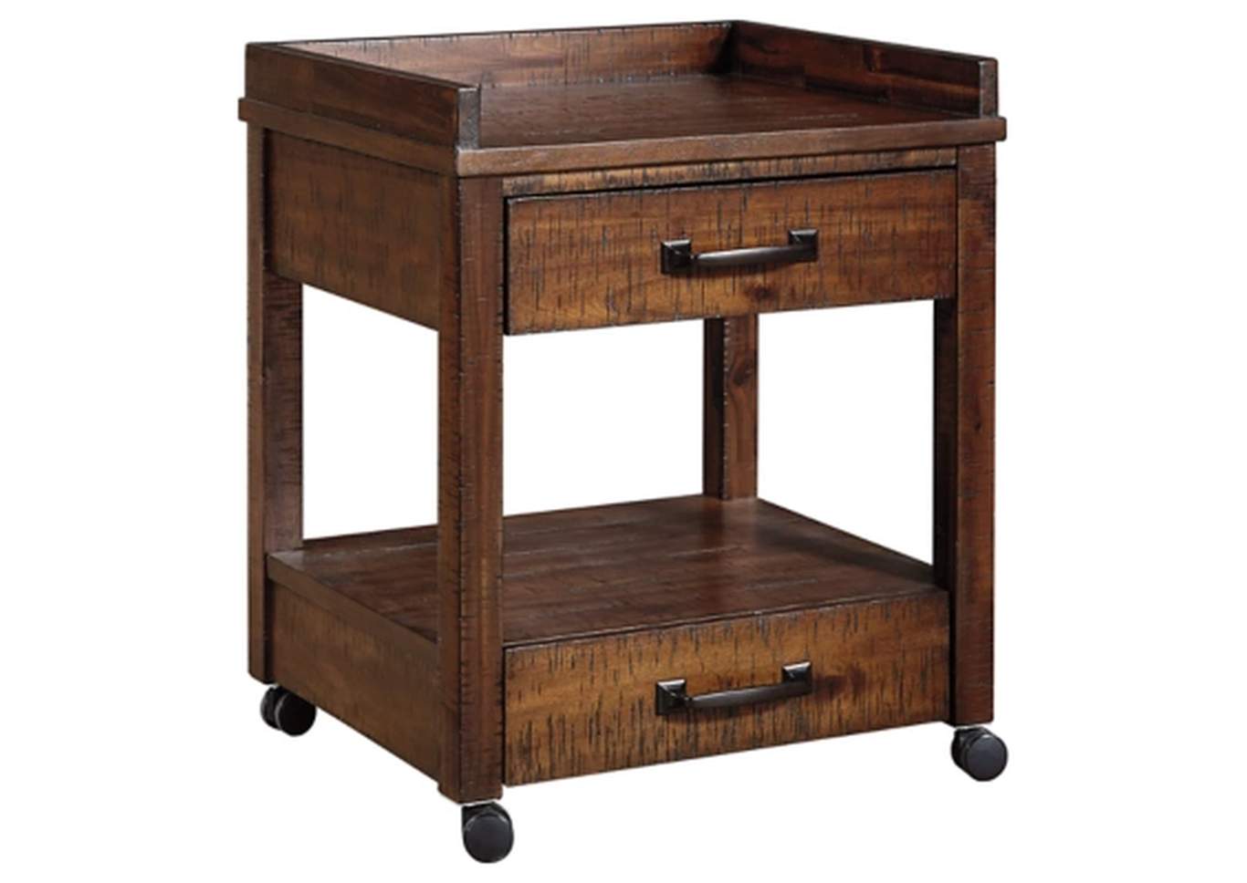 ASHLEY тумба BALDRIDGE (коллекция AMERICAN LIFESTYLE).Стиль: американский Casual.Тип: тумба для документов на мебельных роликах, с двумя выдвижными ящиками, двумя открытыми полками, двумя электрическими розетками и USB- портом для зарядки .Цвет: коричневый.Отделка: "потёртая"с лёгким дефектом от полотна пилы; патинированная металлическая фурнитура цвета цинка.Размеры,мм:ш.533/г.457/в.626.