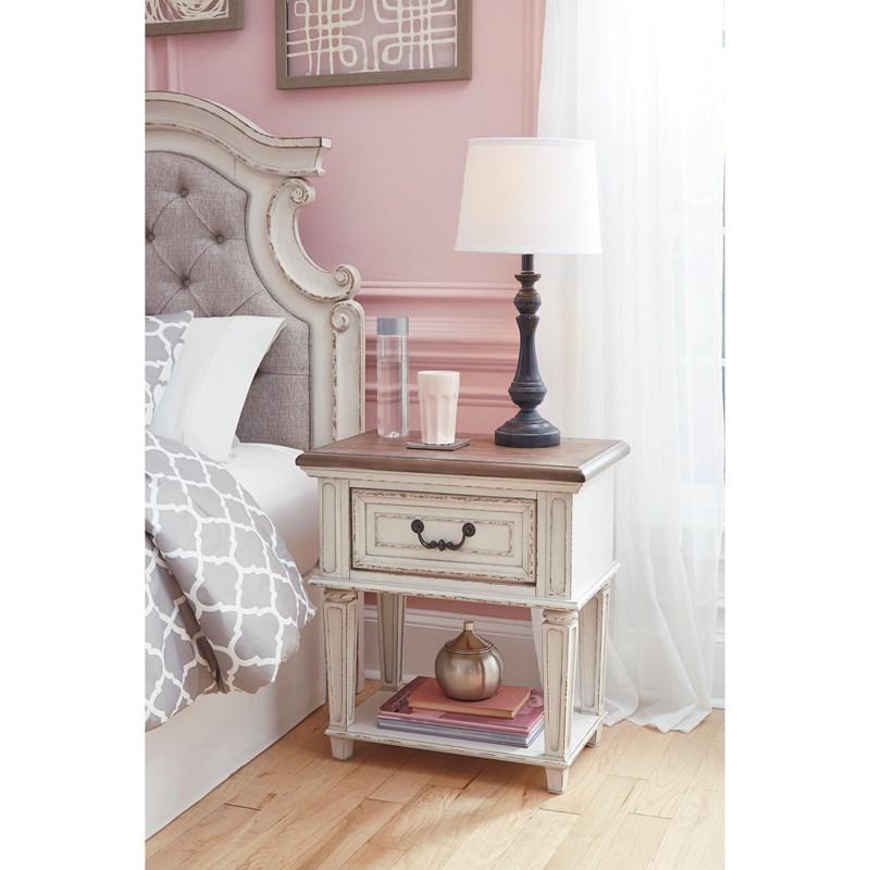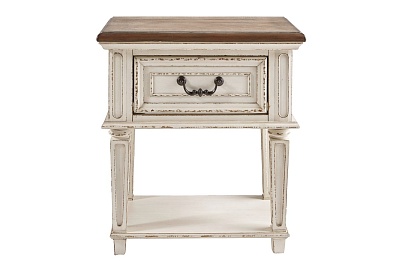 ASHLEY тумба REALYN (коллекция AMERICAN LIFESTYLE).Стиль: американский Vintage Casual.Тип: тумба прикроватная с одним выдвижным ящиком,и одной полкой.Цвет: слоновая кость/коричневый.Отделка: антикварная искусственно состаренная двухцветная;металлическая бронзовая фурнитура.Размеры:ш.610/г.406/в.686.